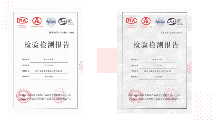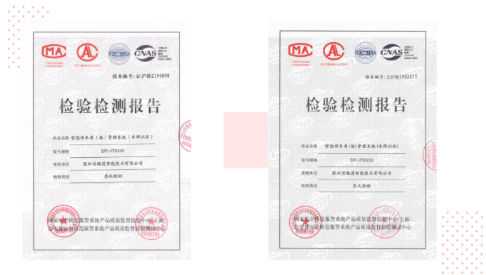 多年來,信路通積極響應智慧停車行業發展趨勢及用戶需求,旗下雙目、雙槍、視頻樁、小黃蜂、道閘等軟硬件產品均送至公安部權威檢測機構并相繼順利通過檢測,獲得相關認證證書。